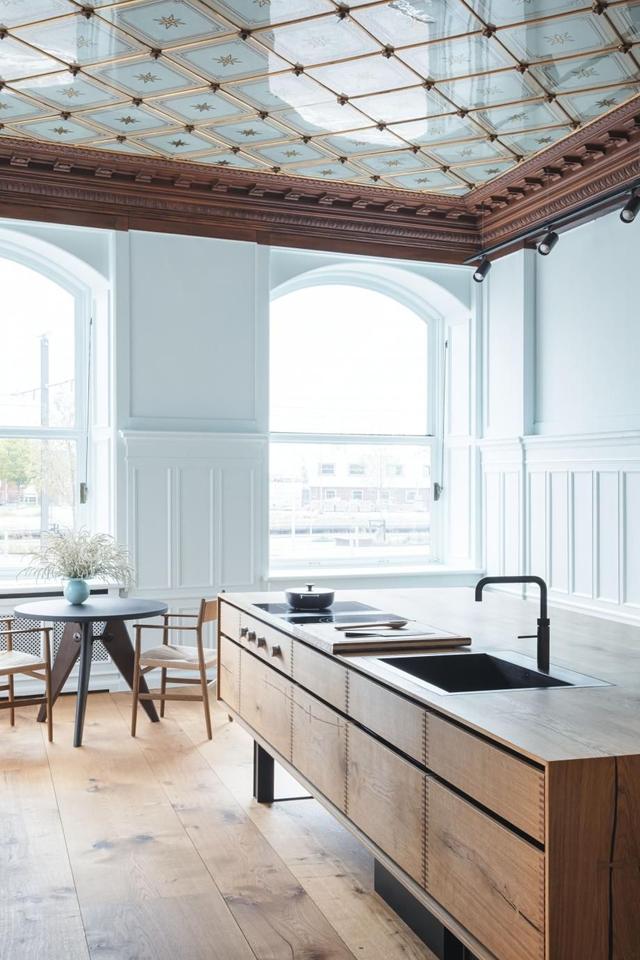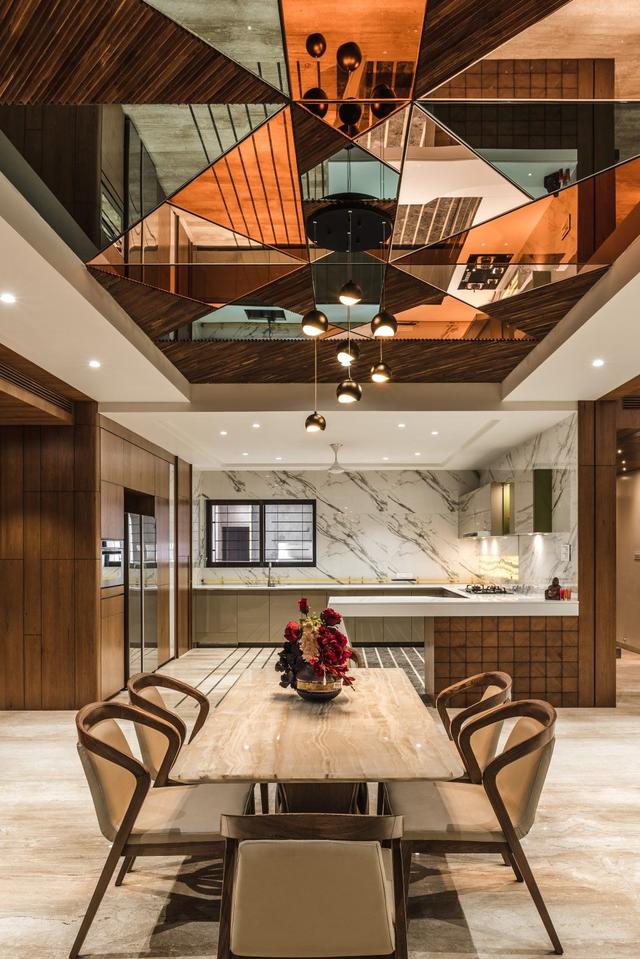 △ 餐厅顶部以几何彩色玻璃做拼接形成绝妙的构图,作为视觉焦点,画面以一种平和的手法赋予空间不一样的装饰艺术效果。
